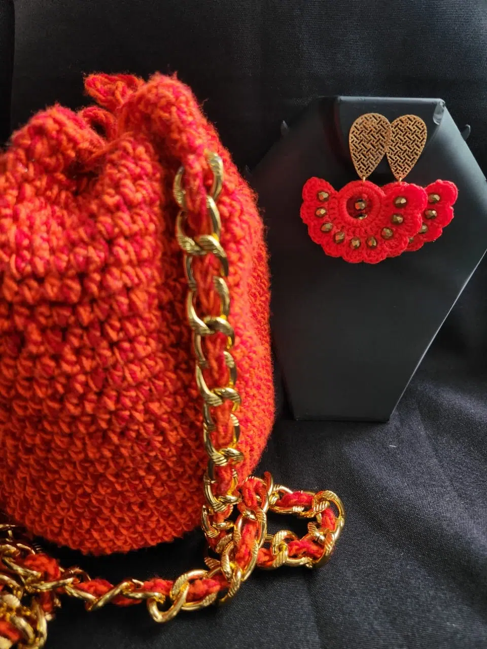 Bolso tejido color naranja acompañado de aretes tipo abanico para formar un lindo conjunto